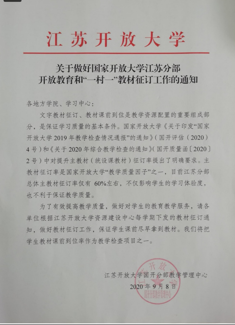 关于做好国家开放大学江苏分部开放教育和“一村一”教材征订工作的通知