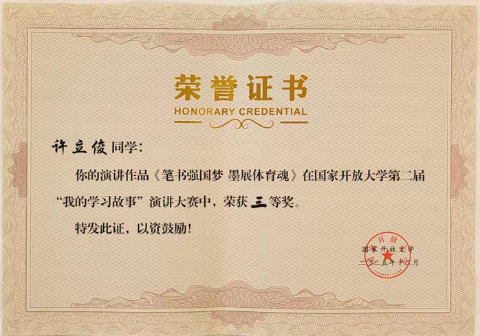 为进一步强化学生思想政治教育,营造具有开放教育特色的校园文化氛围,国家开放大学于今年6月面向办学体系开展第二届“我的学习故事”演讲大赛。国开分部教学管理中心以此次活动作为加强系统文化建设、展现开大学子积极向上精神风貌的重要契机,积极动员办学系统深度挖掘和讲好学生的学习故事,严把作品质量关,认真组织评选后向总部选送3部作品。全国各分部、学院的262位选手进入初赛环节,经过专家评审,15位选手脱颖而出入围全国总决赛。来自南京体育学院的党委常委、宣传部部长、统战部部长许立俊,作为江苏分部首届书法学本科专业学生,在决赛中以《笔书强国梦 墨展体育魂》为题,用质朴的语言、真挚的情感,讲述自己的书法学习故事,被评审专家赞许为坚持终身学习、追逐家国梦想的典型,最终荣获三等奖。